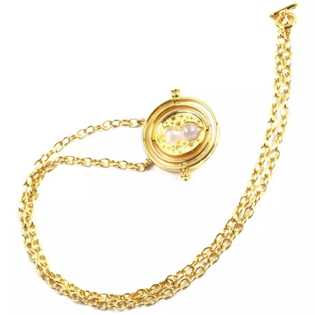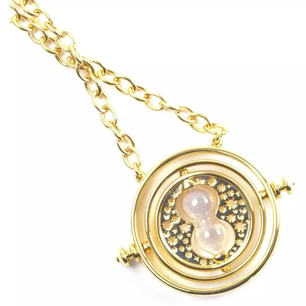 Une réplique authentique du Retourneur de Temps d’Hermione en édition collector (métal plaqué or 24 carats). Un sablier en miniature se trouve au centre des deux anneaux en rotation.