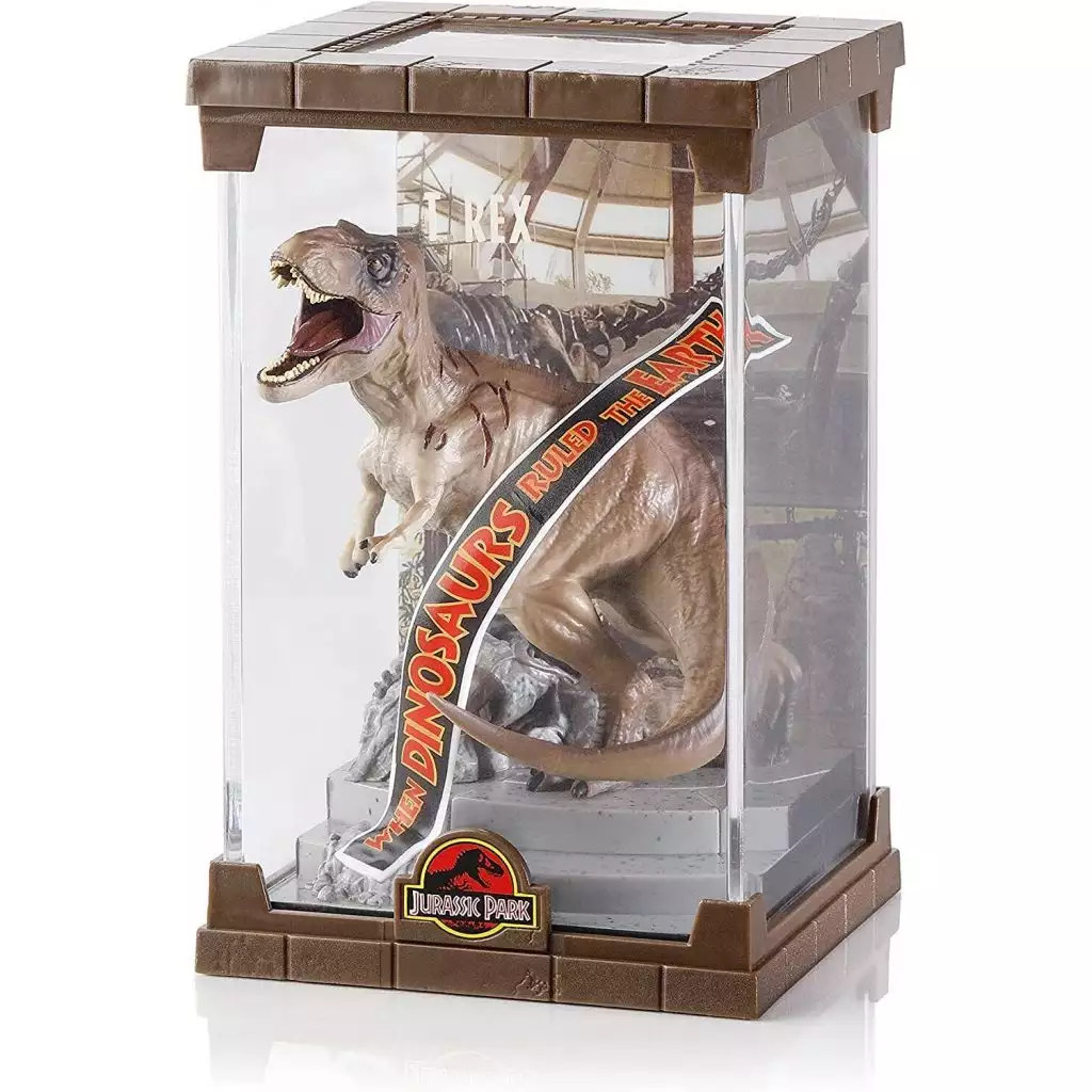 Inspiré par le film Jurassic Park, cette figurine de la marque Noble Collection, représente le T-Rex hurlant dans la partie musée du parc, avec la banderole qui dégringole devant lui.